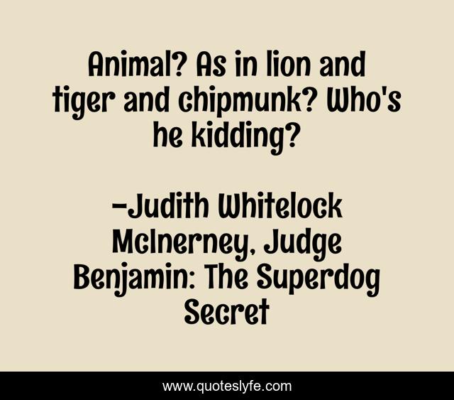 This page presents the quote "Animal? As in lion and tiger and chipmunk? Who's he kidding?". Author of this quote is Judith Whitelock McInerney, Judge Benjamin: The Superdog Secret. This quote is about animals, kidding,.
