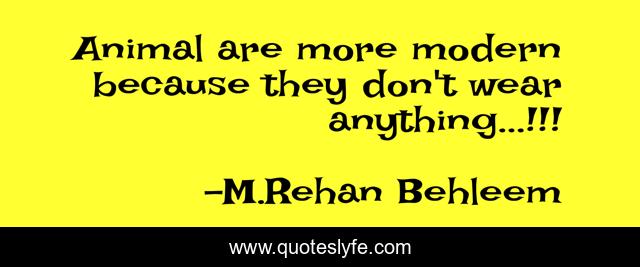 This page presents the quote "Animal are more modern because they don't wear anything...!!!". Author of this quote is M.Rehan Behleem. This quote is about animals, modernity, modernism, modern-life, clothing, clothes,.