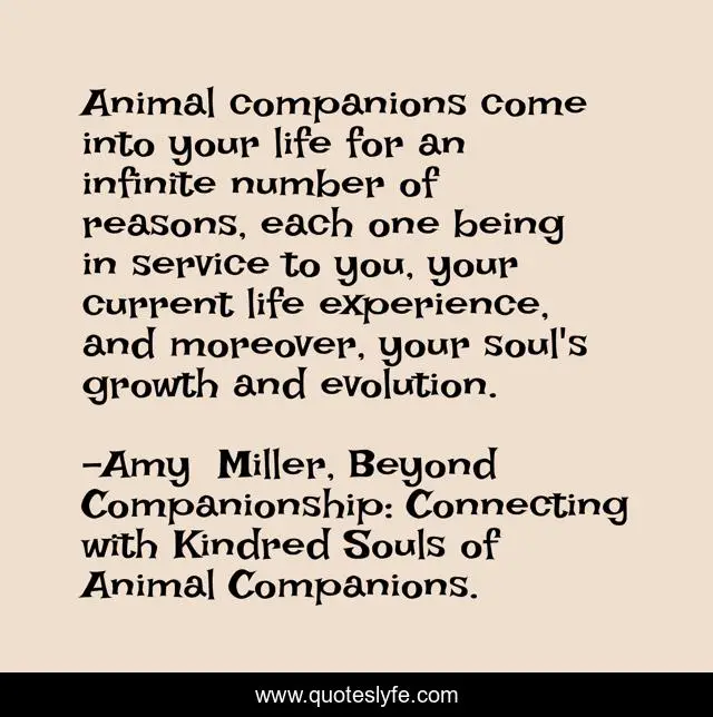 This page presents the quote "Animal companions come into your life for an infinite number of reasons, each one being in service to you, your current life experience, and moreover, your soul's growth and evolution.". Author of this quote is Amy Miller, Beyond Companionship: Connecting with Kindred Souls of Animal Companions.. This quote is about animal-kindness, animals, soul, life-experience,.
