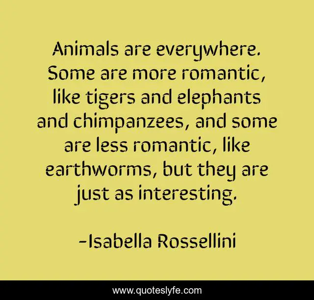 This page presents the quote "Animals are everywhere. Some are more romantic, like tigers and elephants and chimpanzees, and some are less romantic, like earthworms, but they are just as interesting.". Author of this quote is Isabella Rossellini. This quote is about interesting, animals, like,.
