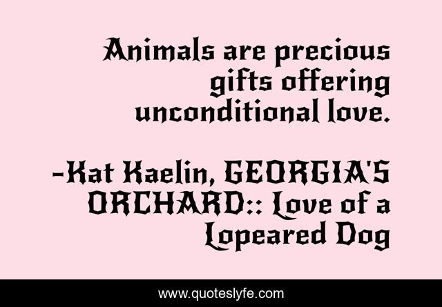 "Kat Kaelin, GEORGIA'S ORCHARD:: Love of a Lopeared Dog Quotes." Quoteslyfe.com, 2025. Fri. 05 Dec. 2025. <https://www.quoteslyfe.com/quote/Animals-are-precious-gifts-offering-unconditional-love-86710>.