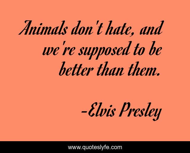 This page presents the quote "Animals don't hate, and we're supposed to be better than them.". Author of this quote is Elvis Presley. This quote is about animals, hate,.