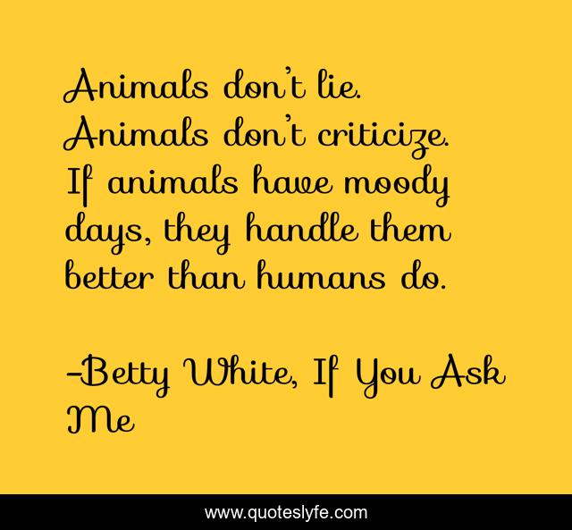 This page presents the quote "Animals don’t lie. Animals don’t criticize. If animals have moody days, they handle them better than humans do.". Author of this quote is Betty White, If You Ask Me. .