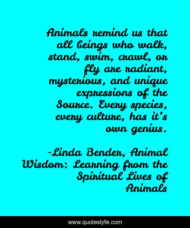 This page presents the quote "Animals remind us that all beings who walk, stand, swim, crawl, or fly are radiant, mysterious, and unique expressions of the Source. Every species, every culture, has it’s own genius.". Author of this quote is Linda Bender, Animal Wisdom: Learning from the Spiritual Lives of Animals. This quote is about spirituality, animals,.