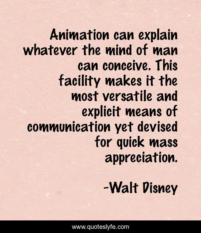 This page presents the quote "Animation can explain whatever the mind of man can conceive. This facility makes it the most versatile and explicit means of communication yet devised for quick mass appreciation.". Author of this quote is Walt Disney. This quote is about appreciation, mind, man,.