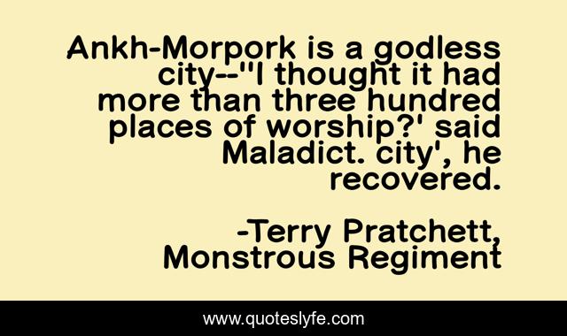 This page presents the quote "Ankh-Morpork is a godless city--''I thought it had more than three hundred places of worship?' said Maladict. city', he recovered.". Author of this quote is Terry Pratchett, Monstrous Regiment. This quote is about religion, humor,.