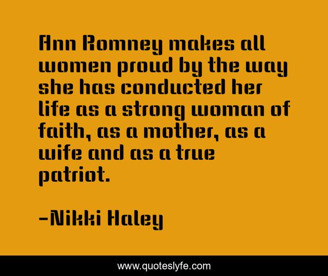 This page presents the quote "Ann Romney makes all women proud by the way she has conducted her life as a strong woman of faith, as a mother, as a wife and as a true patriot.". Author of this quote is Nikki Haley. This quote is about life, women, mother,.