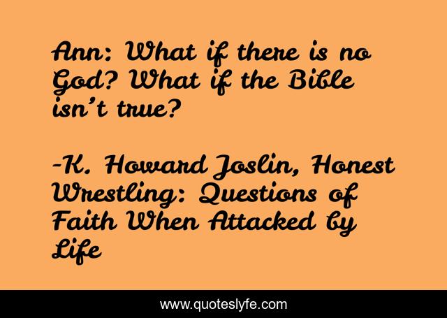 This page presents the quote "Ann: What if there is no God? What if the Bible isn’t true?". Author of this quote is K. Howard Joslin, Honest Wrestling: Questions of Faith When Attacked by Life. This quote is about god, faith, bible, truth, trials,.