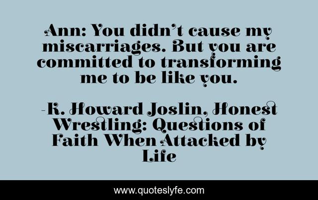 This page presents the quote "Ann: You didn’t cause my miscarriages. But you are committed to transforming me to be like you.". Author of this quote is K. Howard Joslin, Honest Wrestling: Questions of Faith When Attacked by Life. This quote is about miscarriage, faith, trust, character,.