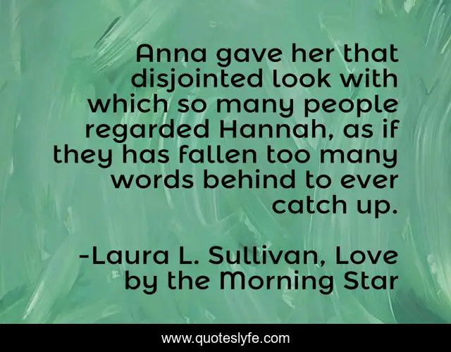 This page presents the quote "Anna gave her that disjointed look with which so many people regarded Hannah, as if they has fallen too many words behind to ever catch up.". Author of this quote is Laura L. Sullivan, Love by the Morning Star. This quote is about humorous, funny, awesome, comedy, hilarious,.