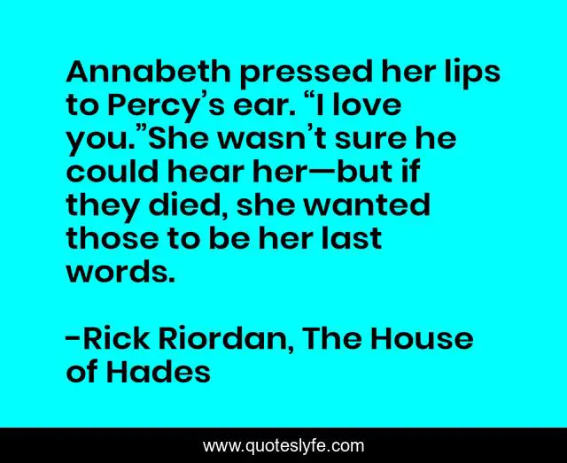 This page presents the quote "Annabeth pressed her lips to Percy’s ear. “I love you.”She wasn’t sure he could hear her—but if they died, she wanted those to be her last words.". Author of this quote is Rick Riordan, The House of Hades. This quote is about love, percy-jackson, annabeth-chase, affection,.