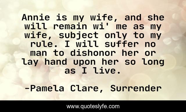 This page presents the quote "Annie is my wife, and she will remain wi' me as my wife, subject only to my rule. I will suffer no man to dishonor her or lay hand upon her so long as I live.". Author of this quote is Pamela Clare, Surrender. This quote is about scotsman, historical-romance,.