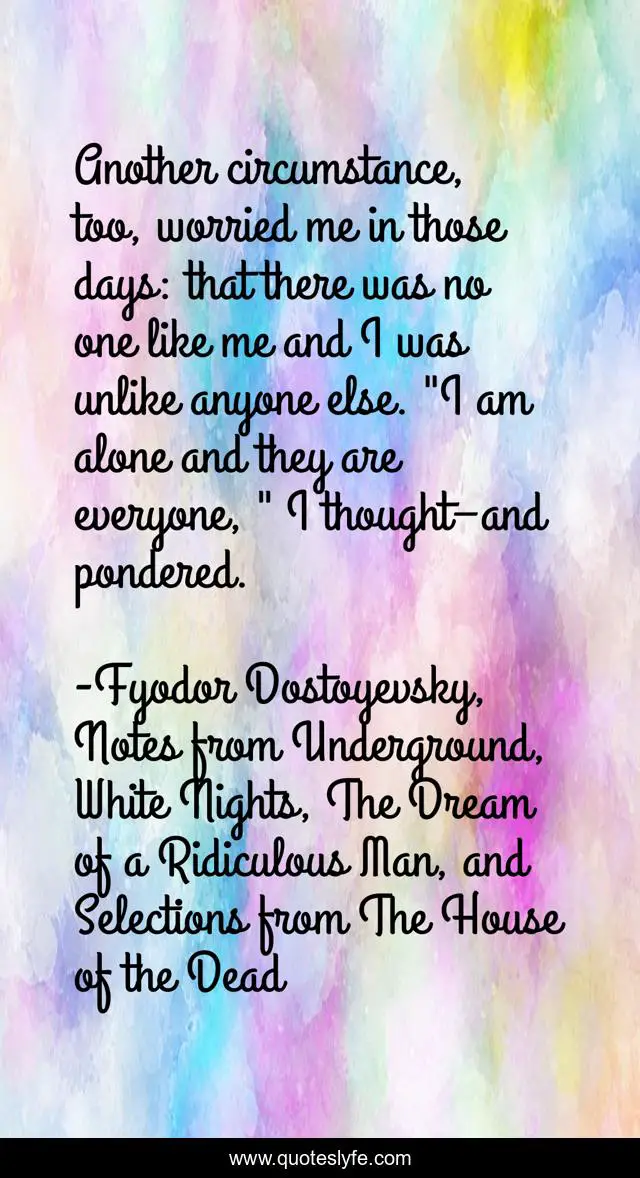 This page presents the quote "Another circumstance, too, worried me in those days: that there was no one like me and I was unlike anyone else. "I am alone and they are everyone, " I thought–and pondered.". Author of this quote is Fyodor Dostoyevsky, Notes from Underground, White Nights, The Dream of a Ridiculous Man, and Selections from The House of the Dead. .