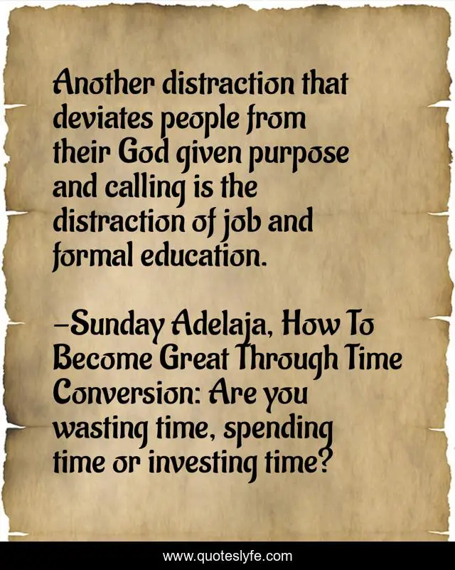 This page presents the quote "Another distraction that deviates people from their God given purpose and calling is the distraction of job and formal education.". Author of this quote is Sunday Adelaja, How To Become Great Through Time Conversion: Are you wasting time, spending time or investing time?. This quote is about people, life, education, conversion, productivity, wealth, god, greatness, waste,.