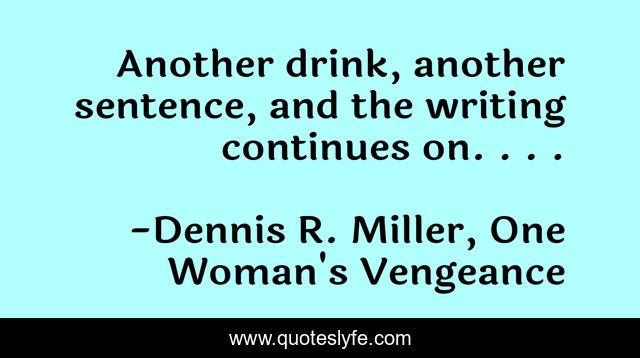 This page presents the quote "Another drink, another sentence, and the writing continues on. . . .". Author of this quote is Dennis R. Miller, One Woman's Vengeance. This quote is about writers, writing-life, on-writing,.