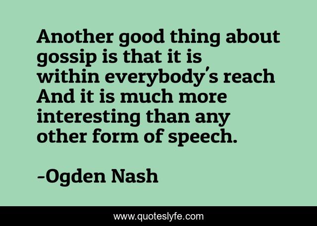 This page presents the quote "Another good thing about gossip is that it is within everybody's reach And it is much more interesting than any other form of speech.". Author of this quote is Ogden Nash. This quote is about gossip, gossips,.