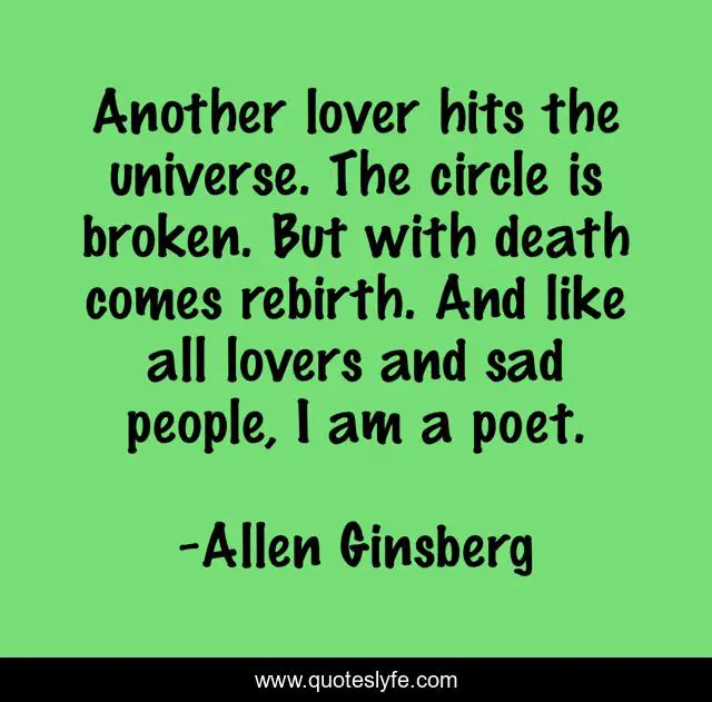 This page presents the quote "Another lover hits the universe. The circle is broken. But with death comes rebirth. And like all lovers and sad people, I am a poet.". Author of this quote is Allen Ginsberg. This quote is about love, poetry, allen-ginsberg, kill-your-darlings, ginsberg, affection,.