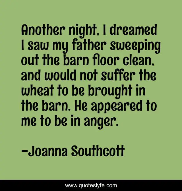 This page presents the quote "Another night, I dreamed I saw my father sweeping out the barn floor clean, and would not suffer the wheat to be brought in the barn. He appeared to me to be in anger.". Author of this quote is Joanna Southcott. This quote is about me, father, night,.