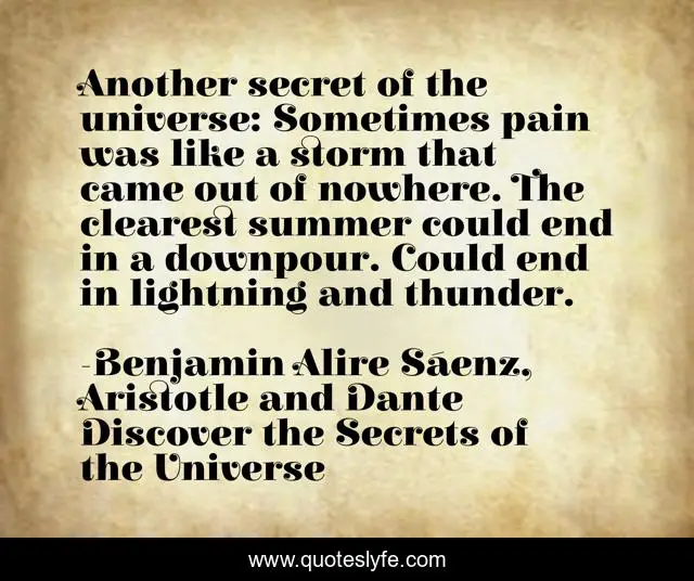 This page presents the quote "Another secret of the universe: Sometimes pain was like a storm that came out of nowhere. The clearest summer could end in a downpour. Could end in lightning and thunder.". Author of this quote is Benjamin Alire Sáenz, Aristotle and Dante Discover the Secrets of the Universe. This quote is about summer, pain, storm,.
