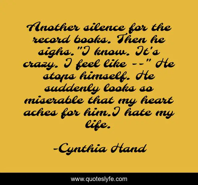 This page presents the quote "Another silence for the record books. Then he sighs."I know. It's crazy. I feel like --" He stops himself. He suddenly looks so miserable that my heart aches for him.I hate my life.". Author of this quote is Cynthia Hand. This quote is about paranormal-romance, angel,.