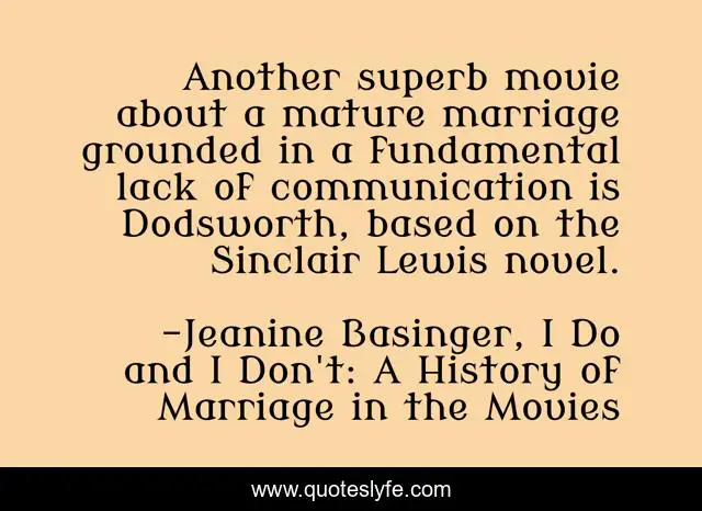 This page presents the quote "Another superb movie about a mature marriage grounded in a fundamental lack of communication is Dodsworth, based on the Sinclair Lewis novel.". Author of this quote is Jeanine Basinger, I Do and I Don't: A History of Marriage in the Movies. .