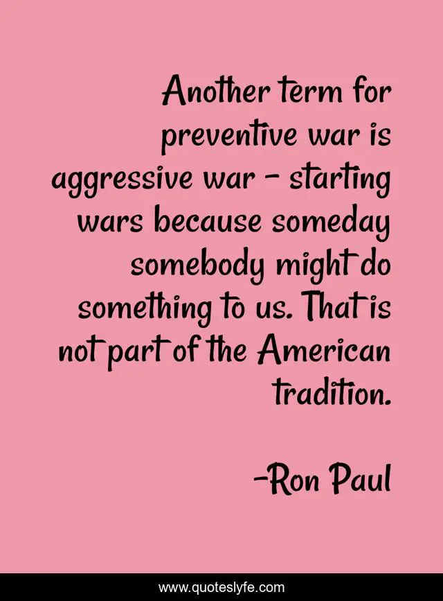 This page presents the quote "Another term for preventive war is aggressive war - starting wars because someday somebody might do something to us. That is not part of the American tradition.". Author of this quote is Ron Paul. This quote is about american, tradition,.