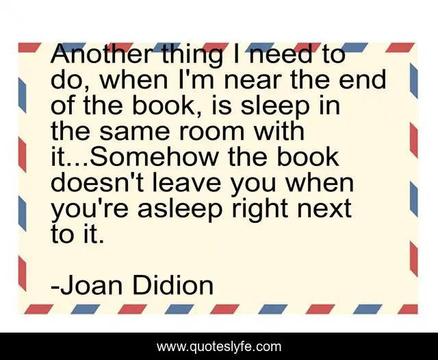 This page presents the quote "Another thing I need to do, when I'm near the end of the book, is sleep in the same room with it...Somehow the book doesn't leave you when you're asleep right next to it.". Author of this quote is Joan Didion. This quote is about books, reading,.