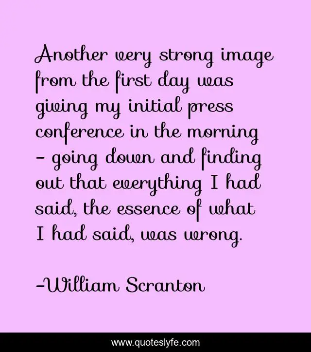 This page presents the quote "Another very strong image from the first day was giving my initial press conference in the morning - going down and finding out that everything I had said, the essence of what I had said, was wrong.". Author of this quote is William Scranton. This quote is about giving, strong, day,.