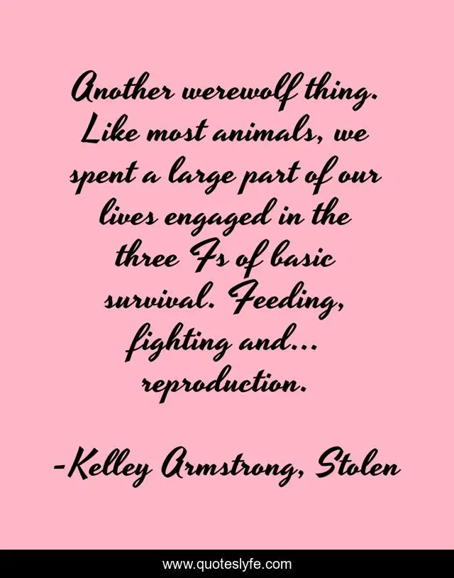 This page presents the quote "Another werewolf thing. Like most animals, we spent a large part of our lives engaged in the three Fs of basic survival. Feeding, fighting and... reproduction.". Author of this quote is Kelley Armstrong, Stolen. This quote is about werewolves, alliteration, humor,.