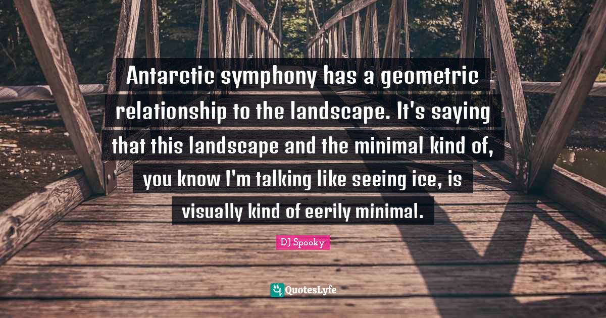 This page presents the quote "Antarctic symphony has a geometric relationship to the landscape. It's saying that this landscape and the minimal kind of, you know I'm talking like seeing ice, is visually kind of eerily minimal.". Author of this quote is DJ Spooky. This quote is about seeing, ice, geometric, landscape, relationship, symphony, talking, kind,.