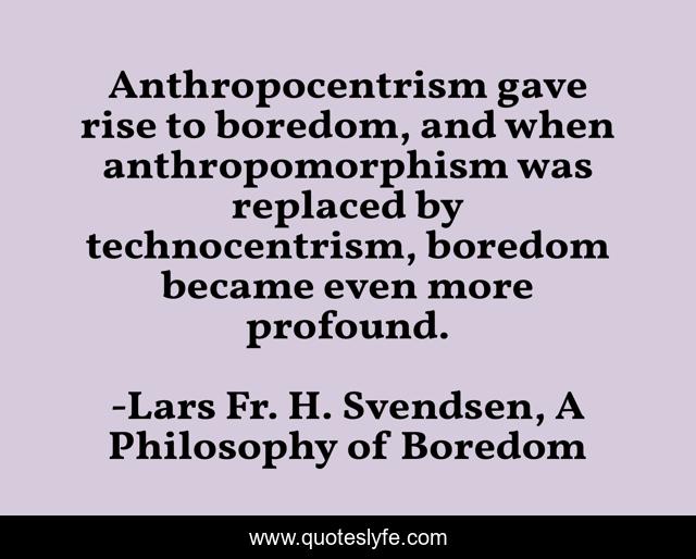 This page presents the quote "Anthropocentrism gave rise to boredom, and when anthropomorphism was replaced by technocentrism, boredom became even more profound.". Author of this quote is Lars Fr. H. Svendsen, A Philosophy of Boredom. .