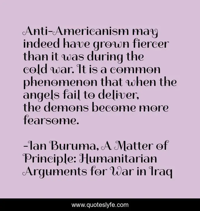 This page presents the quote "Anti-Americanism may indeed have grown fiercer than it was during the cold war. It is a common phenomenon that when the angels fail to deliver, the demons become more fearsome.". Author of this quote is Ian Buruma, A Matter of Principle: Humanitarian Arguments for War in Iraq. This quote is about bigotry, united-states, anti-americanism, politics, leftism, cold-war,.