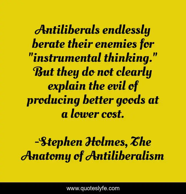 "Stephen Holmes, The Anatomy of Antiliberalism Quotes." Quoteslyfe.com, 2025. Fri. 05 Dec. 2025. <https://www.quoteslyfe.com/quote/Antiliberals-endlessly-berate-their-enemies-for-instrumental-204930>.