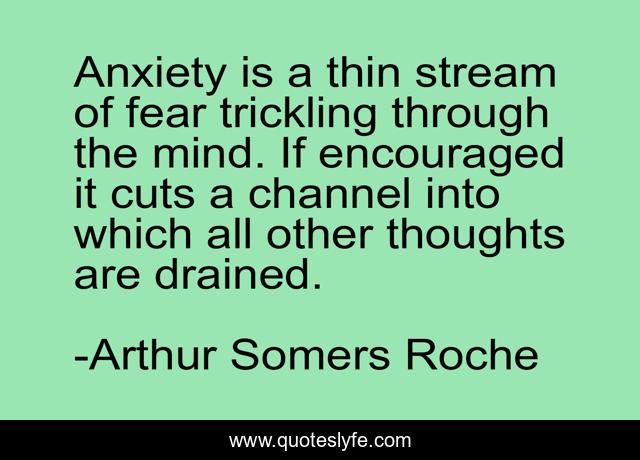 This page presents the quote "Anxiety is a thin stream of fear trickling through the mind. If encouraged it cuts a channel into which all other thoughts are drained.". Author of this quote is Arthur Somers Roche. This quote is about future, anxiety,.
