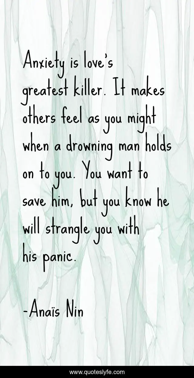 This page presents the quote "Anxiety is love's greatest killer. It makes others feel as you might when a drowning man holds on to you. You want to save him, but you know he will strangle you with his panic.". Author of this quote is Anaïs Nin. This quote is about anxiety, love, saveing, affection,.