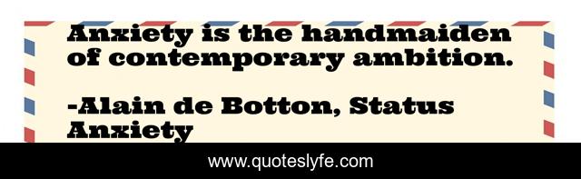 This page presents the quote "Anxiety is the handmaiden of contemporary ambition.". Author of this quote is Alain de Botton, Status Anxiety. This quote is about anxiety, ambition,.