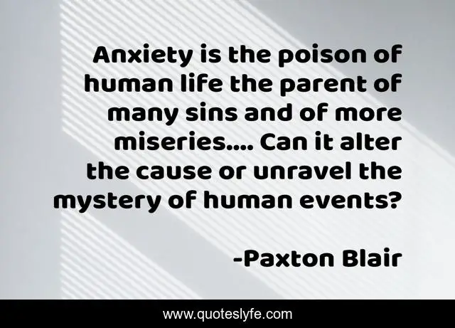 This page presents the quote "Anxiety is the poison of human life the parent of many sins and of more miseries.... Can it alter the cause or unravel the mystery of human events?". Author of this quote is Paxton Blair. .