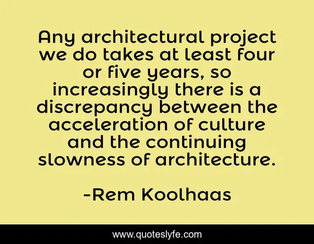 This page presents the quote "Any architectural project we do takes at least four or five years, so increasingly there is a discrepancy between the acceleration of culture and the continuing slowness of architecture.". Author of this quote is Rem Koolhaas. This quote is about project, culture, years,.