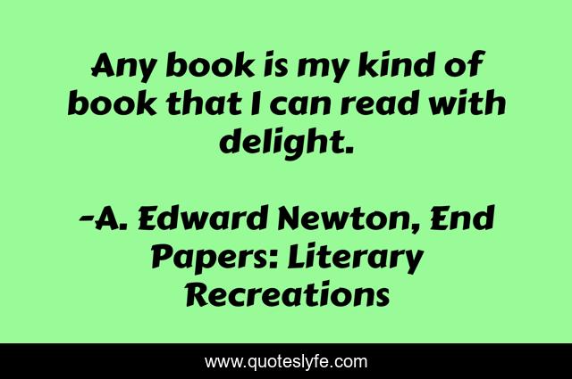 This page presents the quote "Any book is my kind of book that I can read with delight.". Author of this quote is A. Edward Newton, End Papers: Literary Recreations. This quote is about books, reading,.