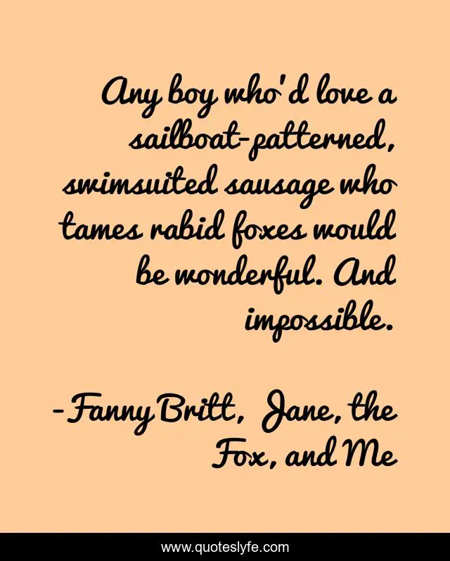 "Fanny Britt, Jane, the Fox, and Me Quotes." Quoteslyfe.com, 2025. Mon. 08 Dec. 2025. <https://www.quoteslyfe.com/quote/Any-boy-who-d-love-a-sailboat-210922>.