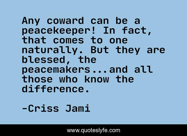 This page presents the quote "Any coward can be a peacekeeper! In fact, that comes to one naturally. But they are blessed, the peacemakers...and all those who know the difference.". Author of this quote is Criss Jami. This quote is about defense, coward, peace, courage, peacekeeper, peacemaker, offense,.