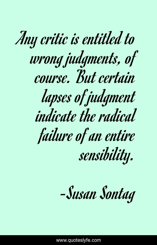 This page presents the quote "Any critic is entitled to wrong judgments, of course. But certain lapses of judgment indicate the radical failure of an entire sensibility.". Author of this quote is Susan Sontag. This quote is about course, critic, judgment,.
