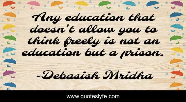 This page presents the quote "Any education that doesn't allow you to think freely is not an education but a prison.". Author of this quote is Debasish Mridha. This quote is about life, love, knowledge, inspirational, intelligence, philosophy, free, wisdom, hope,.