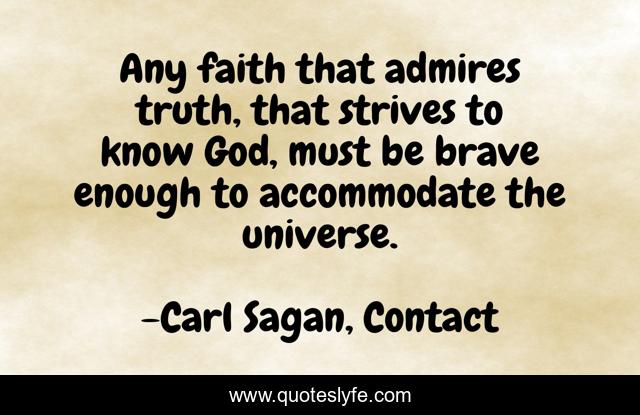 This page presents the quote "Any faith that admires truth, that strives to know God, must be brave enough to accommodate the universe.". Author of this quote is Carl Sagan, Contact. This quote is about science, religion, inspirational, enthusiasm,.