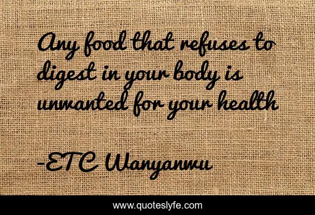 This page presents the quote "Any food that refuses to digest in your body is unwanted for your health". Author of this quote is ETC Wanyanwu. This quote is about body, food, health,.