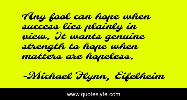 This page presents the quote "Any fool can hope when success lies plainly in view. It wants genuine strength to hope when matters are hopeless.". Author of this quote is Michael Flynn, Eifelheim. This quote is about fools, hopelessness, hope, success,.