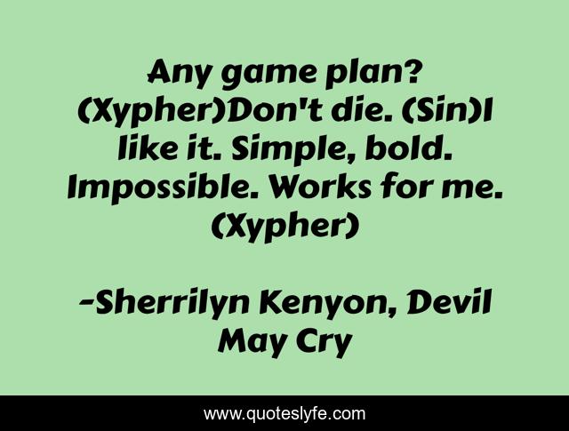 This page presents the quote "Any game plan? (Xypher)Don't die. (Sin)I like it. Simple, bold. Impossible. Works for me. (Xypher)". Author of this quote is Sherrilyn Kenyon, Devil May Cry. .