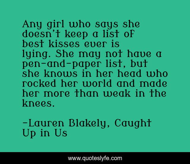 This page presents the quote "Any girl who says she doesn’t keep a list of best kisses ever is lying. She may not have a pen-and-paper list, but she knows in her head who rocked her world and made her more than weak in the knees.". Author of this quote is Lauren Blakely, Caught Up in Us. .