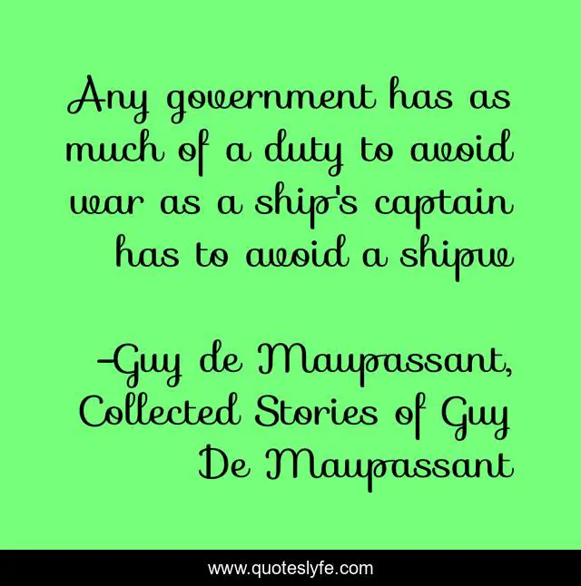 This page presents the quote "Any government has as much of a duty to avoid war as a ship's captain has to avoid a shipw". Author of this quote is Guy de Maupassant, Collected Stories of Guy De Maupassant. This quote is about shipwreck, government, peace, stewardship, steering, leadership, responsibility, war, duties,.