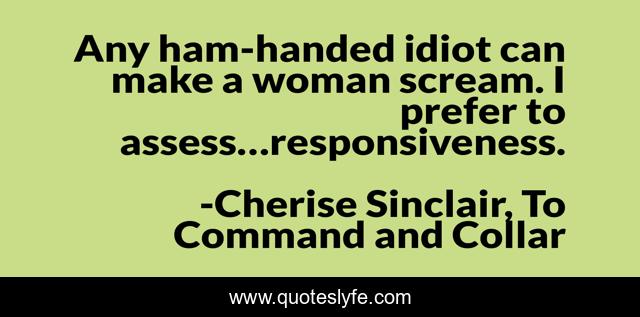 This page presents the quote "Any ham-handed idiot can make a woman scream. I prefer to assess…responsiveness.". Author of this quote is Cherise Sinclair, To Command and Collar. This quote is about erotica, to-command-and-collar, cherise-sinclair,.